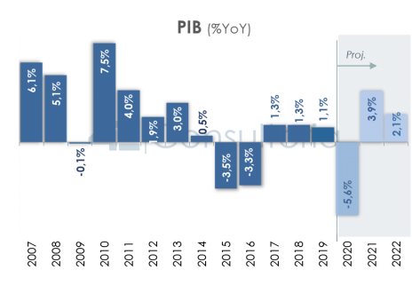 Projeção para o PIB de 2020 é de uma retração de 5,6%. A queda considera os impactos do avanço do coronavírus e uma paralisação que se estende durante o início do terceiro trimestre.