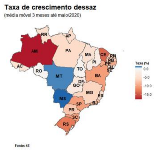 O resultado do PIB regional na média móvel trimestral terminada em maio/2020 trouxe resultados negativos para 25 unidades federativas.