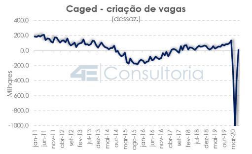 O resultado do Caged de junho acusou destruição líquida de 11,0 mil vagas (+10,8 mil no dado dessazonalizado), menor que a observada em maio, quando houve destruição líquida de 350,3 mil vagas. O número reflete a continuação da retomada da atividade econômica, após o pior período em abril.