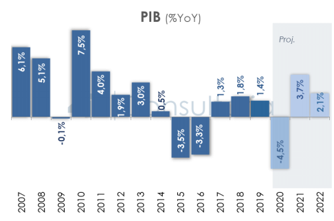Projeção para o PIB de 2020 é de uma retração de 4,5%. A queda considera os impactos do avanço do coronavírus e uma paralisação parcial que se estende durante o terceiro trimestre.