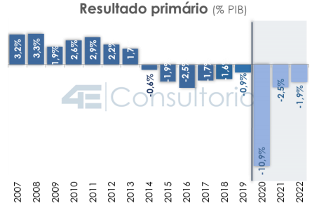 O resultado do setor público consolidado, da mesma forma, foi pouco pior que o de outubro/19, apontando para um déficit acumulado em 12 meses, como proporção do PIB, de 9,1%, ante 1,2% no acumulado até outubro de 2019.